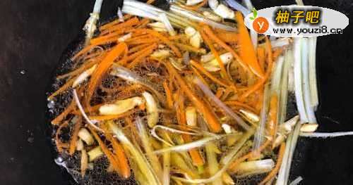 7倒出油后锅中留下少许油,爆香蒜碎放入红萝卜丝及大葱丝。稍炒后倒入调味汁,调味汁稍微浓稠后倒入肉片翻匀即可