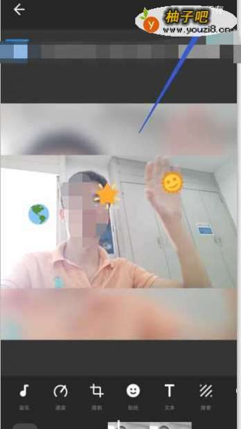 4接下来进入到视频预览页面,点击右侧√,返回到视频编辑界面,点击其中的表情贴纸按钮选项,如下图所示。