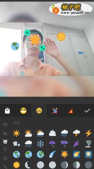 5然后选择如下图指示的表情内容,星球在自然分类里面,如果没有,需要先下载所有的贴纸才可以。
