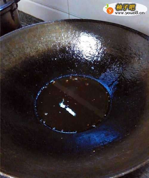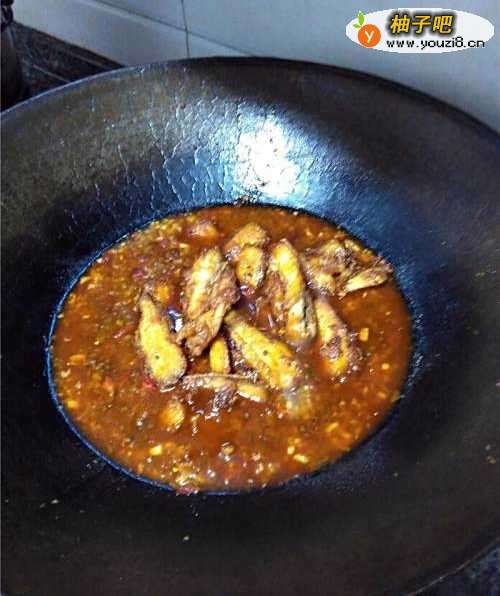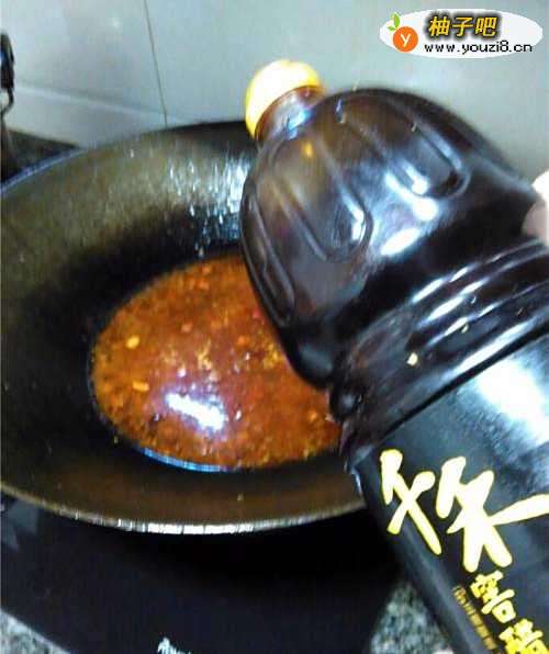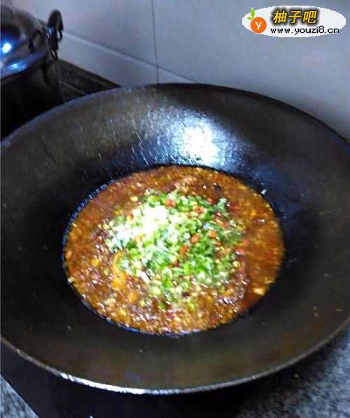8炒锅里留底油,炒香豆瓣酱,放入干辣椒、花椒炒香,之后放入泡椒、泡菜、泡姜、姜末,蒜末碎炒香。