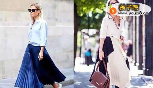 3白色翻领衬衫搭配米色和蓝色拼接百褶半身裙,非常潮流时尚的穿搭,不但能够很好的彰显出个人强大的气场,同时给人一种模特般的感觉,很能够提升个人的形象。