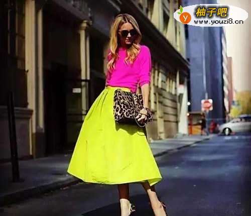 2玫红色上衣搭配黄色半身裙搭配豹纹高跟鞋豹纹包包,非常高级的搭配,不但显得整个人非常有活力,同时又很优雅,而且又充满女性的诱惑力,给人一种很高档的感觉。