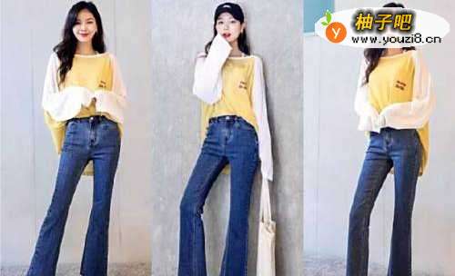撞色卫衣搭配九分高腰微喇叭形牛仔裤搭配小白鞋,非常青春靓丽的搭配,不但恩能够彰显出完美的身材,同时有着很好的减龄效果,给人一种高大上的感觉。