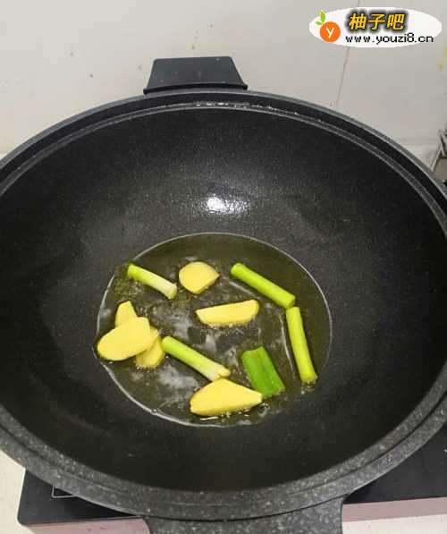 2热锅冷油放入葱段、姜片煸香。