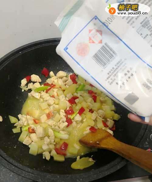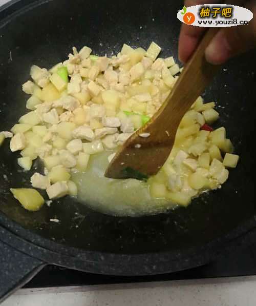 5倒入土豆丁翻炒均匀后、加入适量水焖煮1分钟。