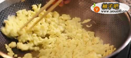 3这时候,起锅烧油,将鸡蛋液倒入锅中,煎好后用筷子将鸡蛋搅碎;