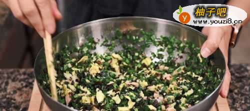 4然后,韭菜碎放入橄榄油、香油、花椒油,搅拌均匀,调好馅料;