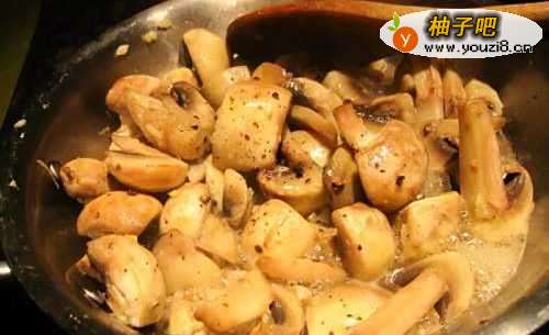 3等到大蒜吸饱了油,带着较深的黄色之时,将蘑菇下锅,洒点盐和黑胡椒
