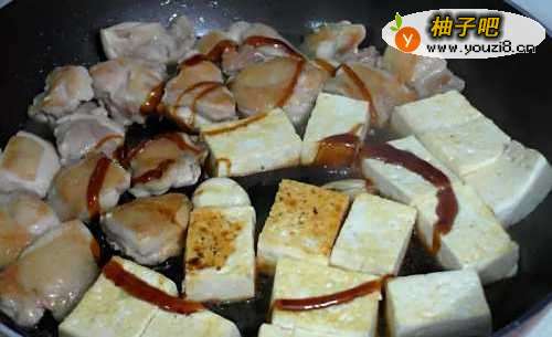 2鸡油煸出来后放入板豆腐煎至两面金黄,过程中也顺便帮鸡肉翻面