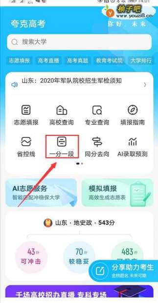 1、进入【夸克高考】2、选项【搜索】-【夸克高考】3、选择【一分一段】选项4、在一分一段页面可以筛选查询