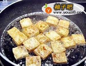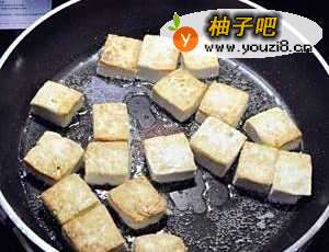 等油热时,把火调成小火,轻轻的放入豆腐。(放豆腐时不要怕,不会溅油。)
