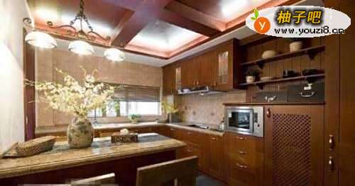 3餐厅和厨房合二为一,石英石的台面比较的环保和健康,如此特别的厨房就应该选择这样的吊顶,在这样的环境里进餐,是不是十分的享受呢!简单的吊灯,让厨房更加的时尚。
