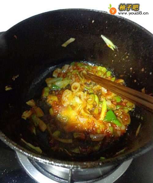 2锅放油烧热,放大葱、辣椒酱炒香。