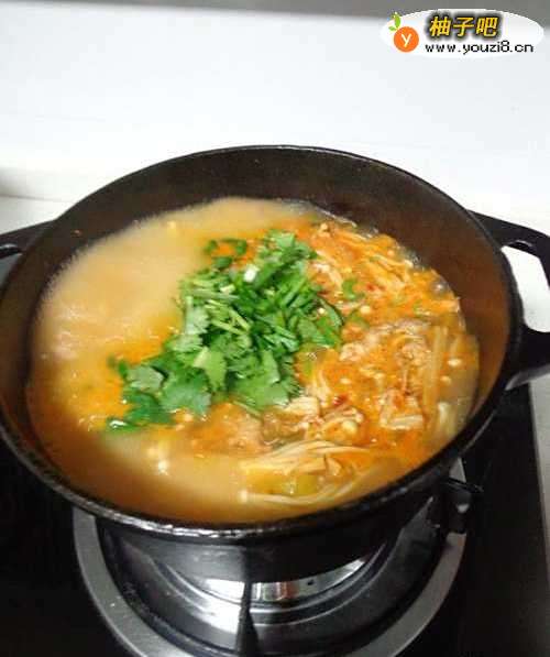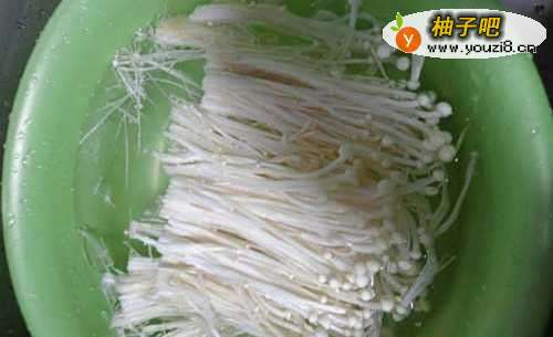 3锅中放入纯净水烧开,放金针菇、肥牛片。