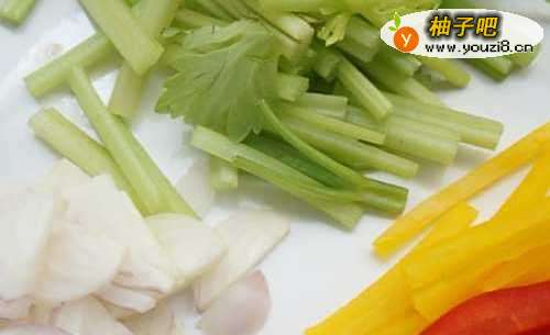 洋葱洗净去皮切丝,香芹切段,彩椒切丝,鸡蛋打散备用。