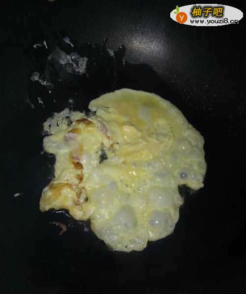 3将鸡蛋打入碗里,打匀;开火,将鸡蛋液倒入锅里炒熟、再打散;