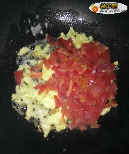 4将切好的西红柿丁倒入锅里,翻炒均匀,再加入少量的糖,翻炒均匀;