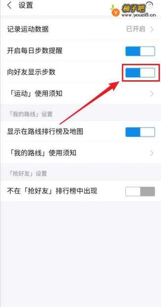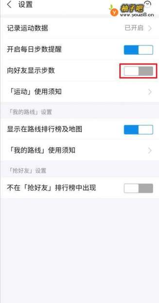 4向好友显示步数右侧开关已关闭。见下图