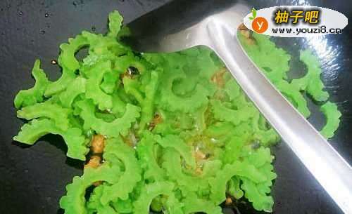 5:倒入苦瓜,翻炒片刻。调入食盐和料酒,翻炒均匀即可。