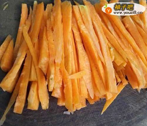 2新鲜的胡萝卜50克,去掉胡萝卜皮切成丝状备用。