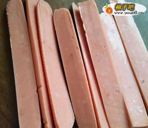 准备好火腿肠80克,去掉外包装切成条状备用。