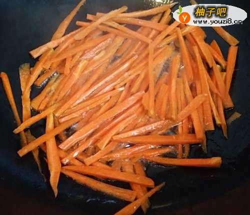 4洗干净炒锅,加入食用油先炒胡萝卜,再加入火腿肠一起翻炒。