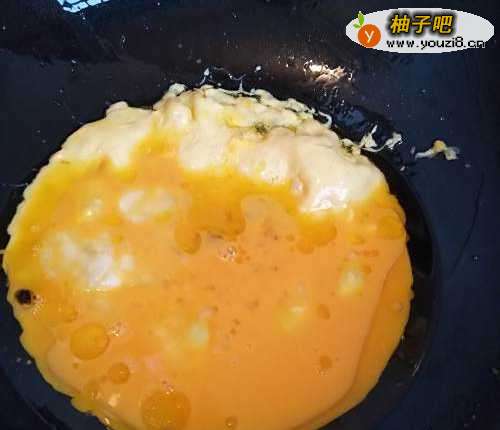 5将鸡蛋倒入炒锅里面煎好盛到盘子里与胡萝卜、火腿肠放一起。