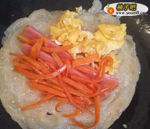 6手抓饼放到炒锅里面,煎好加入鸡蛋、火腿肠和胡萝卜卷起来即可。