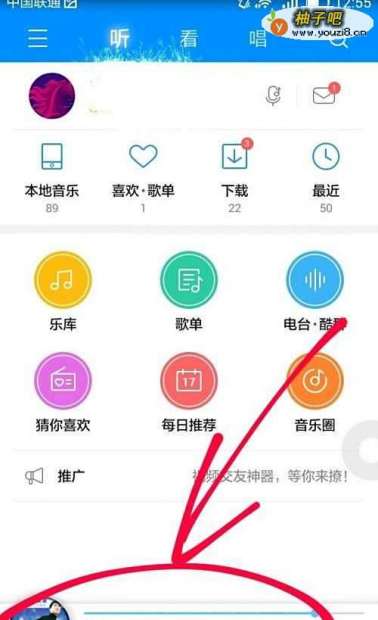 2这时在打开的应用首页中,我们能够看到页面下方正在播放歌曲的播放进度条,我们点击选择该进度条;