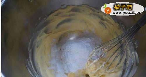 44、将中筋面粉、低筋面粉、泡打粉混合过筛,加入打发的黄油内,用橡皮刮刀将粉类和黄油轻轻翻拌均匀。