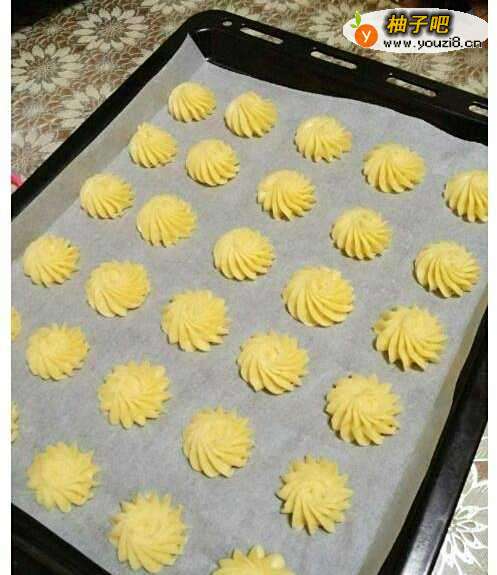 55、裱花袋内装入面糊,以中号菊花嘴在烤盘上挤出花型,中间要留些空隙。烤箱于180°C预热,以上下火180°C,中层烤10分钟,再移至上层,转150°C烤5分钟。