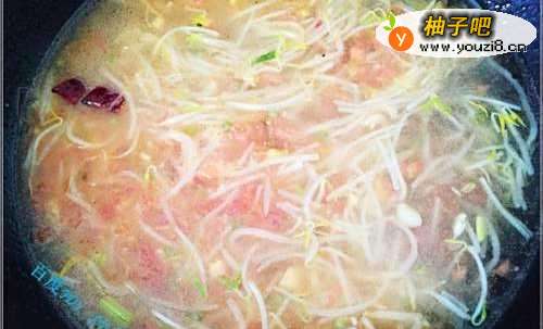 6这些都准备好后就可以开始煮了,打开电磁炉,往锅内加入适量的油,放入少许蒜末、生姜丝、干辣椒等爆香一会,先倒入洗净的豆芽,快速炒软,然后加入前面剁好的西红柿碎末。