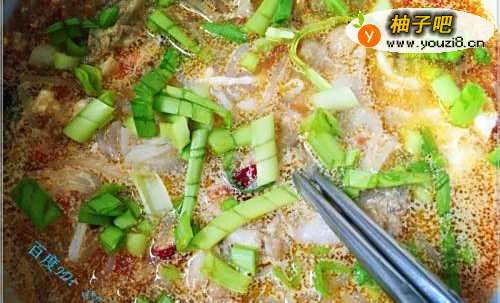 9试舀出一小部分汤,尝尝咸淡,合适后就可以将这些烫倒入前面的大碗中。将锅洗干净,沥干水渍,然后加入适量的油,将油加热后淋入前面的田鸡肉中,一碗色香味都有的水煮田鸡肉就做好了。
