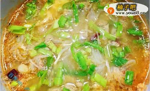 7翻炒一会后,待豆芽基本变软,往锅内加入适量的水,将汤烧开,将前面腌制田鸡肉剩下的蛋黄加入少许水,将其均匀打散成蛋黄液,倒入锅内勾芡。