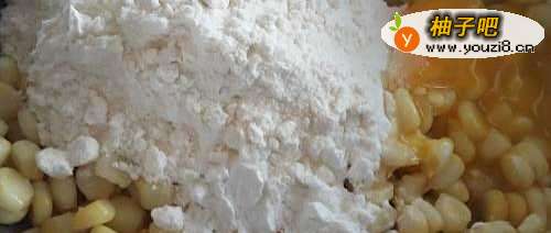 玉米搓成玉米粒,放在小盆里。加入面粉,淀粉,鸡蛋黄搅拌,让玉米粒裹上均匀的糊。