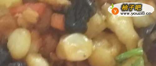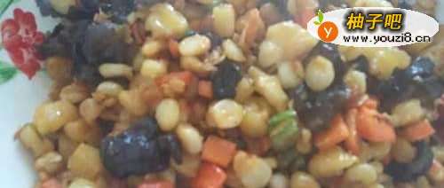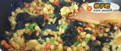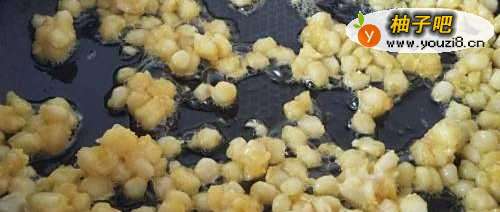 3锅内多放入油烧热,加入玉米粒,先不要急于翻炒,稍定型再用锅铲炒。小火慢炒,玉米粒炒散。