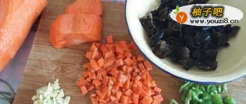 2蒜切碎了。胡萝卜去皮,和辣椒切成小丁。木耳泡发后撕成小朵。