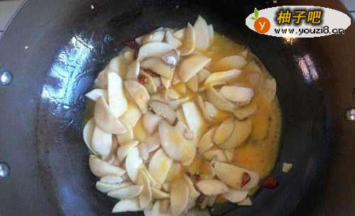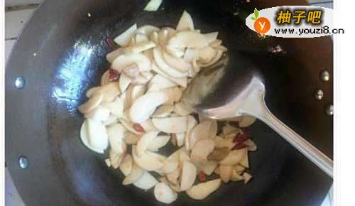 3锅里多放点油,放入杏鲍菇和干辣椒翻炒,直至杏鲍菇颜色变得稍微有点金黄。