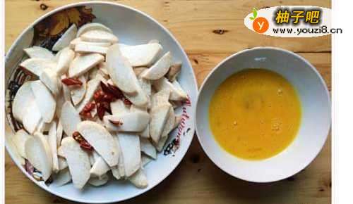 2杏鲍菇洗净切片,鸡蛋加点盐打散,干辣椒切好后放入杏鲍菇一起待用即可。