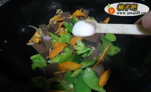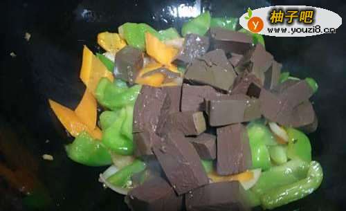 5加入鸭血,进行翻炒,加一点食醋提味去腥。