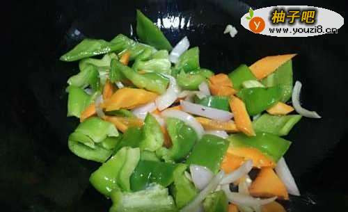 4加青椒和胡萝卜大火翻炒2分钟