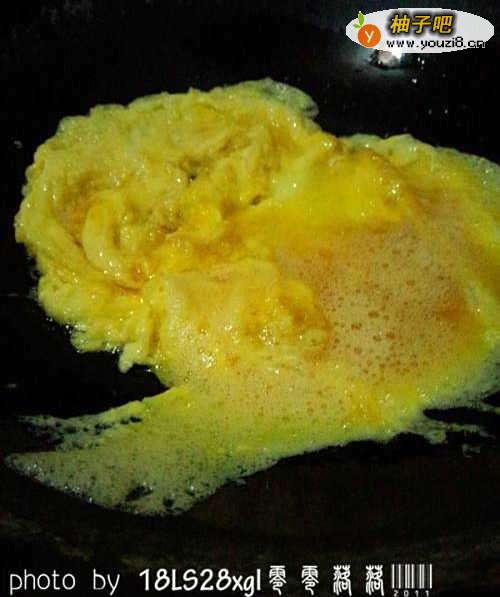 4炒锅烧热,放入油烧至8成热,倒入打散的蛋液,用筷子划散。鸡蛋定型成小块状,即可盛出备用;不要炒得太久;