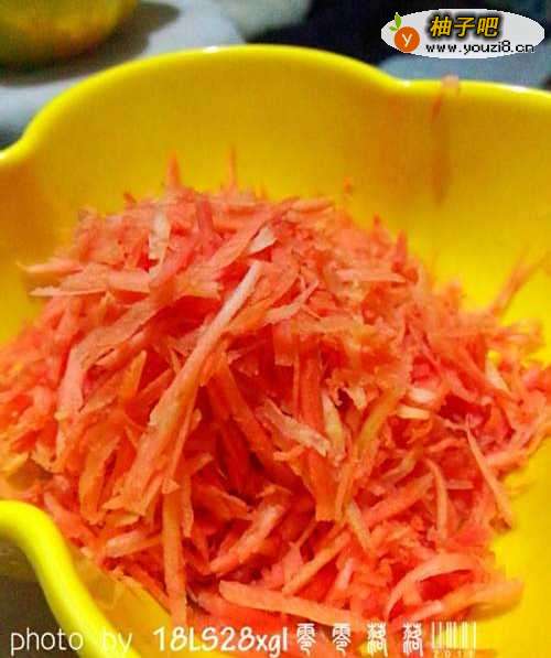 胡萝卜去皮,洗净,切成细丝;可以借助工具,省时省力。