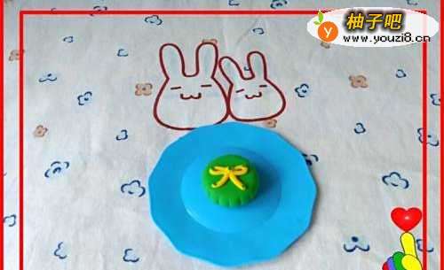 6取黄色彩泥适量滚搓一个小圆球,粘合在蝴蝶结的中心位置。再取绿色彩泥适量,制作5个小圆点,粘合在蝴蝶结上面进行点缀。