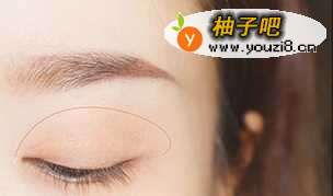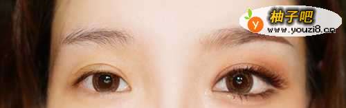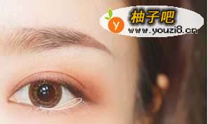 2眉粉填补眉毛空隙处,之后用浅蜜桃色眼影粉大面积刷在眼皮上,横向范围超过眼长。砖红色眼影粉刷在眼皮上,范围比上一步略小,同样横向范围超过眼睛实际长度。