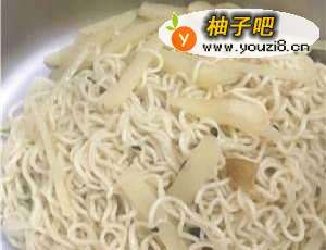 5炒熟以后,把面条从冷水中捞出放入锅中继续翻炒。
