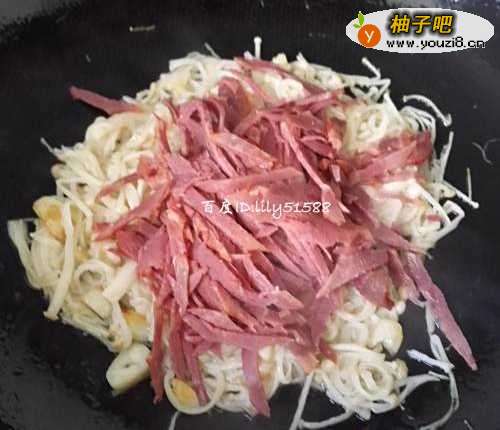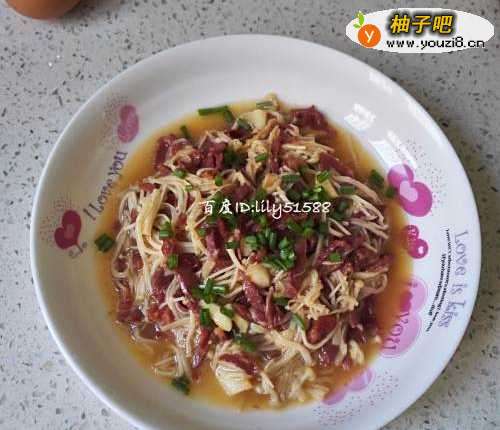 6放入金针菇炒1分钟变软了之后,放入牛肉一起炒。