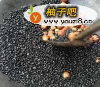 5然后把板栗藏到陶粒一会儿,然后继续炒,直至炒熟!