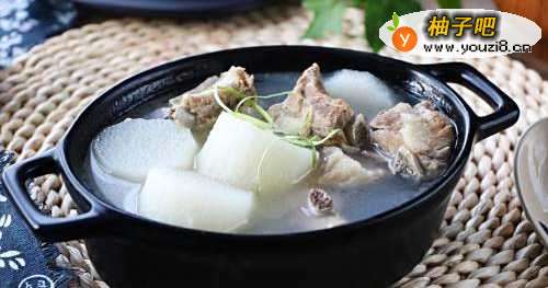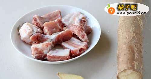 5排骨炖出白色的汤时,放入山药,继续炖;
