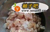 100克的鸡胸肉切丁,加八克的料酒,八克的生抽和少许盐拌匀腌制30分钟